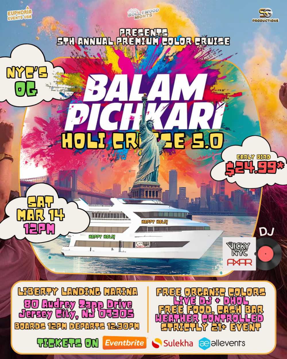 Come join us to celebrate the festival of colors. 🚨The 5th Annual Balam Pichkari is back! NYC’s premier Holi cruise returns to the Hudson 🌊 Get set for an epic spring bash filled with beats, colors, and endless joy!