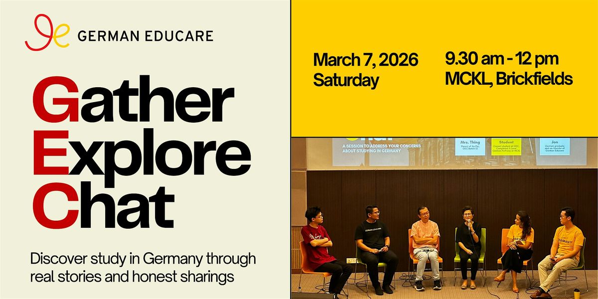 - **Event Description**: Discover study in Germany through real stories and honest sharings.About this EventReal stories. Honest sharings.If you’ve ever wondered, “What is it really like to study and live in Germany?” - this event is for you.Gather, Explore, Chat is our recurring, forum-style session where students, parents, and educators come together for one simple reason:to talk honestly about the Germany journey.At every session, we bring together people who have actually lived the journey - each from a different perspective - to share openly, honestly, and realistically.You’ll hear from:? A student currently studying in Germany, sharing real-life experiences - academics, daily life, challenges, and surprises?‍?‍? A parent whose child has gone through our full programme, from preparation all the way to now studying in Germany? Our founder, a German university graduate, sharing why Germany is such a powerful option for Malaysian students — and what it really takes to succeed? A professor from a partner German university, offering insights into the German education system, university expectations, and on-the-ground realitiesWhy we do this:We know that choosing to study overseas - especially in Germany - comes with a lot of questions.Is Germany really suitable for my child?What is student life actually like there?Is it manageable — academically, financially, emotionally?What kind of support do students really need beyond language classes and applications?Gather, Explore, Chat exists to answer these questions honestly - and to help you see the full picture before making any decisions.What you’ll walk away with?A realistic understanding of student life in GermanyInsights that go beyond language, visas, and university applicationsPerspectives from students, parents, educators, and academicsA chance to ask questions freely and hear honest answersWho should come?Students considering studying in GermanyParents who want clarity before committingAnyone who values trust, transparency, and real guidanceOne last thingYou don’t have to decide anything at this event.You just have to listen, ask, and explore.That’s what Gather, Explore, Chat is all about.Book your seats now!Date: 7th March 2026 (Sat)Time: 10am - 12pm, Registration starts at 9.30amVenue: Auditorium, Level 3, MCKL  https://cdn-az.allevents.in/events5/banners/3da8b170-fdbc-11f0-97b0-bf8aa747ab8d-rimg-w740-h740-dc2b1e12-gmir.jpg   https://cdn-az.allevents.in/events8/banners/3ddb8140-fdbc-11f0-97b0-bf8aa747ab8d-rimg-w987-h740-dc90918c-gmir.jpg   https://cdn-az.allevents.in/events9/banners/3e032d80-fdbc-11f0-aee8-2beb4adade3d-rimg-w987-h740-dc795d47-gmir.jpg   https://cdn-az.allevents.in/events10/banners/3e311b50-fdbc-11f0-aee8-2beb4adade3d-rimg-w555-h740-dcd9c38f-gmir.jpg