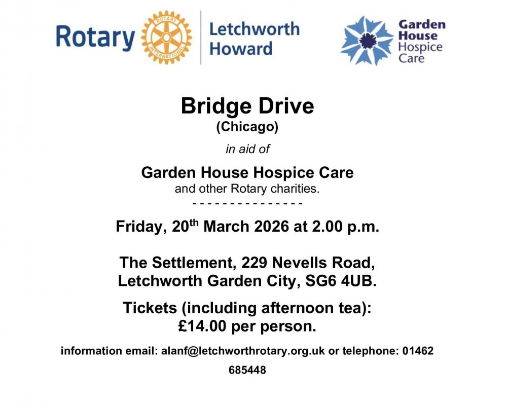 Then this is for you. Letchworth Howard Rotary Club’s annual bridge drive in aid of
