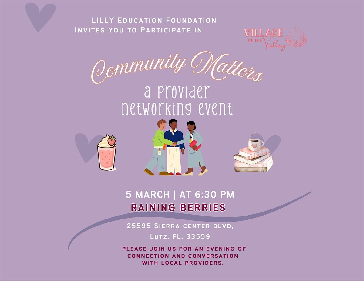 - **Event Description**: We are so excited to invite you to our March Village in the Valley provider networking event. Join us for a sweet treat on us!About this EventJoin Us for our March Village in the Valley event!Don't miss out on the LILLY March Village in the Valley, an exciting in-person event where great minds come together. Connect, share, and grow your network with us (LILLY) and other fellow providers in a relaxed and friendly setting (and enjoy a coffee or smoothie on us!).We have been deeply moved by the positive engagement, interest, and feedback we have received about the February Village in the Valley speed networking event. It is an honor to share space with such passionate people! This has inspired the topic and focus of our March Village in the Valley; we intend to focus on deepening connections with providers. Given this, along with partnership inquiries, we will dedicate time to presenting on new opporunities to connect with LILLY Education Foundation. We will present on the development of our Community Partnership Network, including its heart/mission and membership information for prospective partners. Following this, we will have some informal networking intended for connection and discussion with us and fellow providers with shared passions.Whether you're an aspiring provider looking for inspiration or a current provider looking to develop or deepen connections, this is the event for you. We believe that community (your villlage in the valley) matters deeply.Note: The Raining Berries room has limited space so this is the reason for limited sign up spots through this eventbrite link. If you see there are no spots remaining, please reach out to emily@lillyedu.org for other opportunities to connect.We can't wait to see you all there!