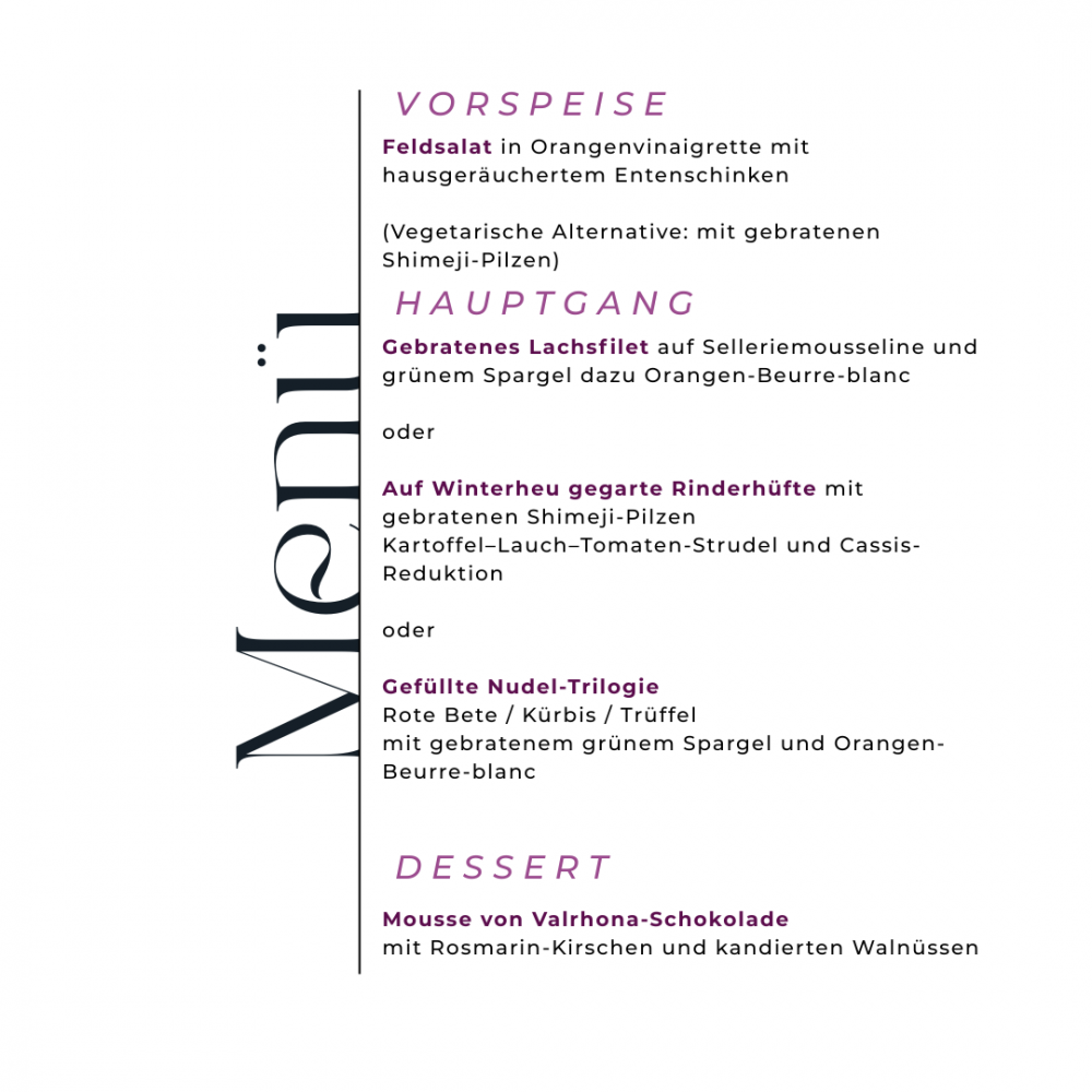 Zum Empfang begrüßen wir Sie mit einem Welcome Drink. Anschließend genießen Sie ein wahlbares 3-Gang-Menü, das mit viel Liebe zum Detail und hochwertigen Zutaten komponiert wurde.