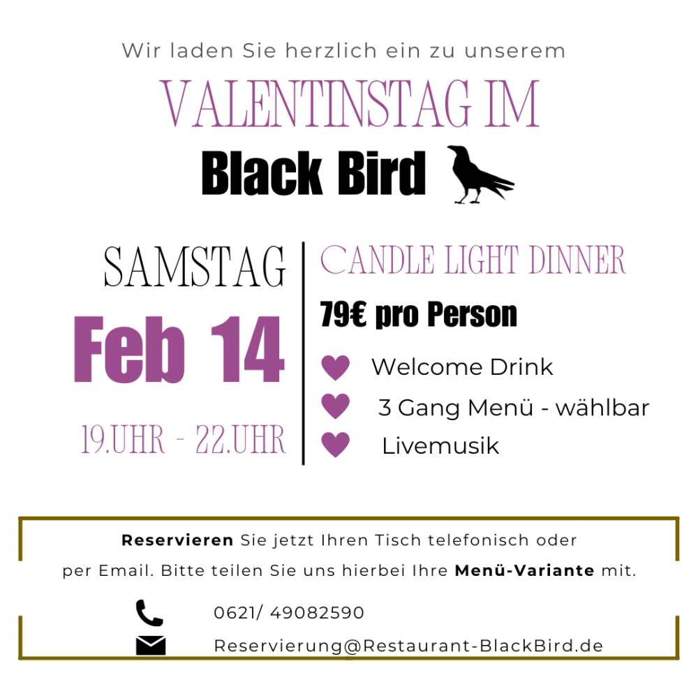 Erleben Sie einen unvergesslichen Valentinstag im stilvollen Ambiente des Black Bird. Unser exklusives Candle Light Dinner bietet den perfekten Rahmen für einen romantischen Abend zu zweit – mit fein abgestimmter Küche, warmem Kerzenschein und stimmungsvoller Livemusik.