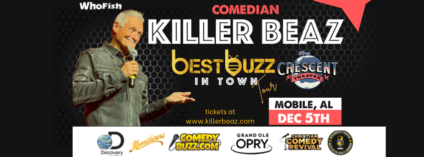 Celebrating the milestone of 10 seasons on Discovery Channel’s hit series, “Moonshiners”, comedian Killer Beaz is running the roads delivering his new “Best Buzz in Town” tour of outrageously funny and clean comedy. This legendary comedian continues to make regular performances at The Grand Ole Opry, and is headed, loaded down with laughs, to the Crescent Theatre in Mobile, AL, Fri, Dec 5th at 7:00 PM