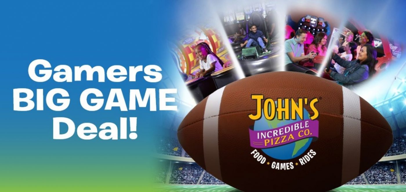 It’s our Gamers Big Game event! Watch the football action on our big screens Sunday, Feb 8 with an all you can eat buffet of pizza, chicken nuggets, sides, desserts, endless soft drinks, and more, plus 50% off video games and rides! Cold beer on tap available for extra purchase. Get your coupon at www.johnspizza.com/biggame.