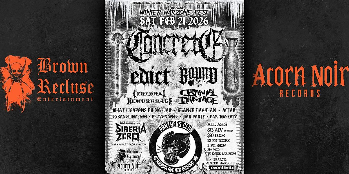 - **Event Description**: 10 hours of Brutal music!About this EventWinter Warzone Fest 1doors 12 noonmusic 1pm-11pmAll ages21 w/ ID to enter bar roomConcrete, Edict, Bound , Cerebral hemmorage, Cranial damagewhat weapons bring war, Branch davidian, Altar, Exsanguination, Provenance, War Party , Far too lateRedident DJ Siberia Zero spinning darkwave / goth/ breakcore  https://cdn-az.allevents.in/events4/banners/d1006c90-fc29-11f0-9f5f-e3f99e9163d2-rimg-w592-h740-dcefefef-gmir.jpg