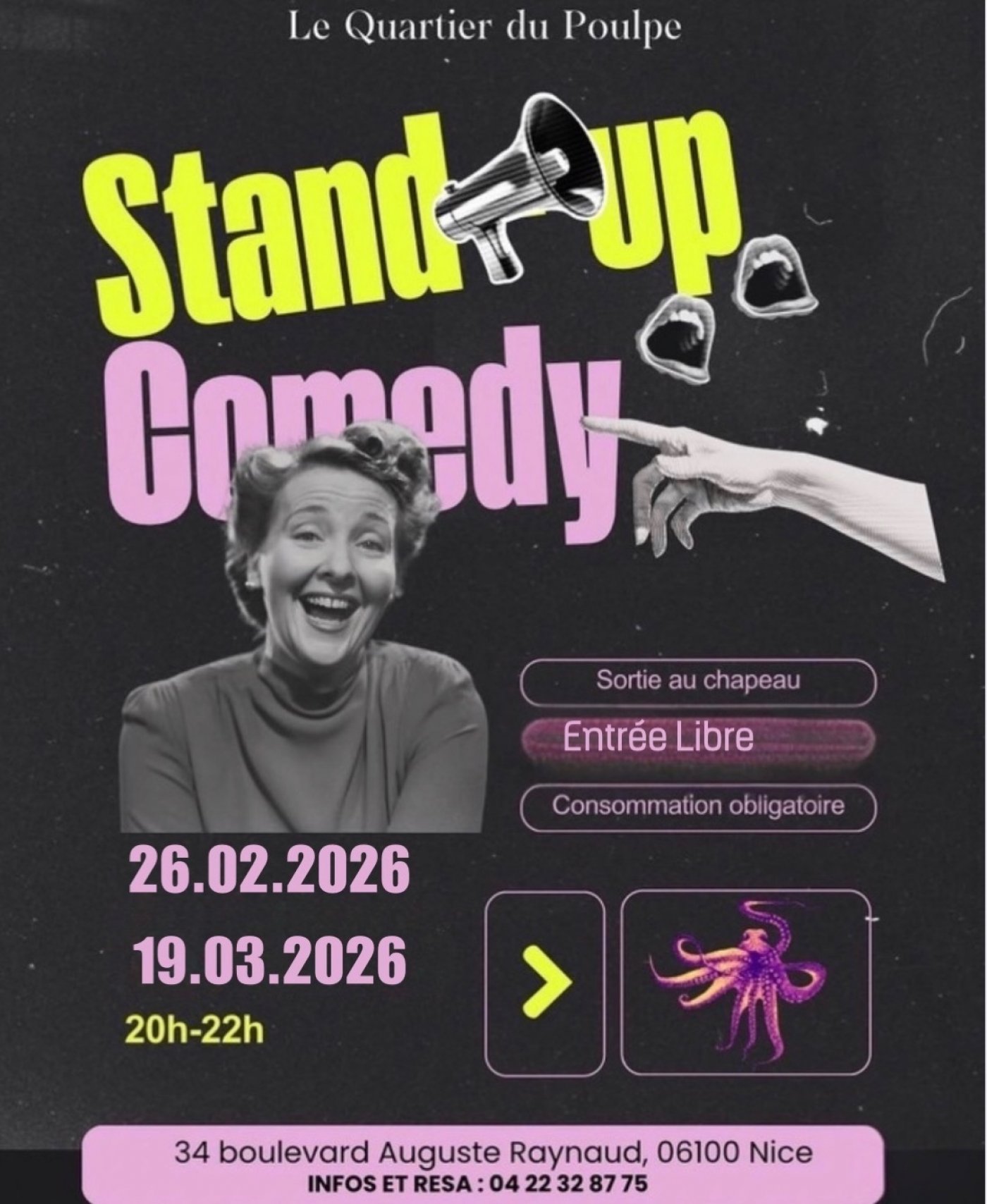 Get ready to experience a night filled with laughter at STAND UP NIGHT . Join us on March 19, 2026, at 8:00 PM at the vibrant LE QUARTIER DU POULPE in Nice for a night of pure entertainment.