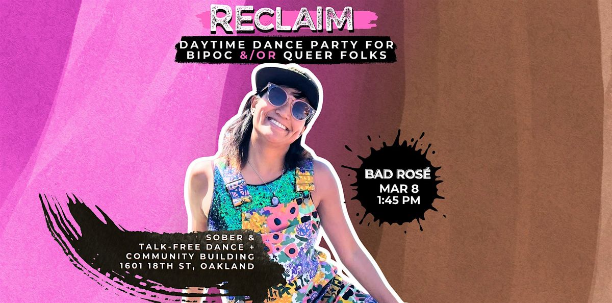- **Event Description**: RECLAIM is a daytime dance party for people who are BIPOC, Queer, or both!About this EventSunday, March 8, Bandaloop, West OaklandRECLAIM is a daytime dance party for people who are BIPOC, Queer, or both!? The MusicBad Rosé curates dance experiences with the goal of creating energetic, inclusive spaces where dancers lead the vibe and the music follows. Her sets invite release, unified movement, and deep presence on the dancefloor. Expect bass-heavy rhythms, playful grooves, and genre-crossing moments.As a proud Filipina and member of the LGBTQ+ community- Bad Rosé brings her lived experience and heart-centered activism into everything she does. Beyond the decks she is engaged in social justice work with unhoused and at-risk youth-grounding her artistry in compassion, equity, and community empowerment. Her love for plants, animals, and the earth shapes the way she approaches both activism and the dance floor -as living ecosystems rooted in connection, resilience, and collective well-being.? Our CommunityRECLAIM is about creating a vibrant space where bipoc and queer folks can come together, connect, and vibe as one community. Our goal? To build bridges and unite, so we can dance our way into the future we’ve been dreaming of.We’re calling all BIPOC folks—whether you’re Black, Indigenous, or a Person of Color—to join us on the dance floor. And we’re calling all QUEER folks—gay, lesbian, bisexual, trans, questioning, gender-nonconforming, or however you proudly define your queerness.To be clear: if you’re white and queer, come on down! If you’re brown and straight, we want you too! The only thing we ask is that you bring your best self and be ready to groove.Our VisionRECLAIM envisions a world where bipoc and queer people are moving towards liberation together. We center the Black, the Brown, and Queer because now, more than ever, we need fresh visions to create a thriving world for all—regardless of who we love, how we identify, or the melanin in our skin.Our mission is to unite BIPOC and Queer dancers through communal movement, self-expression, and meaningful exchange. By dancing together, we empower ourselves to build deeper connections, find courage, and co-create a more just and compassionate world.RECLAIM stands in solidarity with Black, Brown, Queer, Indigenous, Palestinian, Congolese, Sudanese and all people resisting oppressive systems.Connect with us!LinkTreeInstagramFacebook Group PageJoin our Mailing Listwww.reclaimdance.orgAgenda?: 01:45 PMDoors OpenInfo: Doors open, arrival &amp; warm-up (for new dancers, check in takes 5 mins)?: 02:00 PM - 02:15 PMOpening Circle and IcebreakerInfo: Meet your fellow dancers!?: 02:15 PM - 04:15 PMDance!Info: The music has an intentional arc from soft to PUMPING to chill again, so you can move and feel all aspects of you.?: 03:15 PMDOORS CLOSE - NO ENTRY?: 04:15 PM - 04:30 PMDecompressionInfo: Guided rest period and community announcements?: 04:30 PM - 05:30 PMAfter GatherInfo: Join us for After-Gather, a time to meet new friends while enjoying fresh fruit and having interesting conversations.