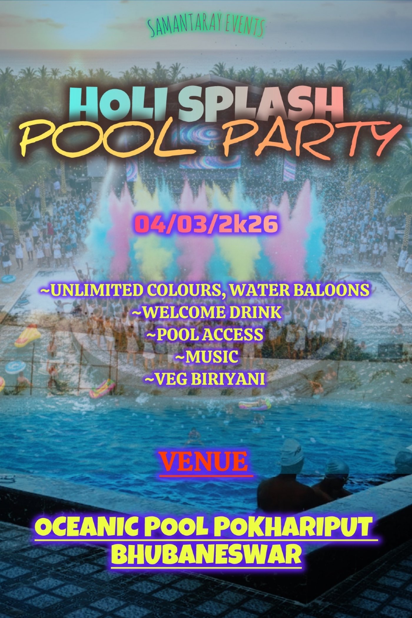 The ticket includes complimentary welcome drink, unlimited colours n water balloons ,music 🎵 and pool access.