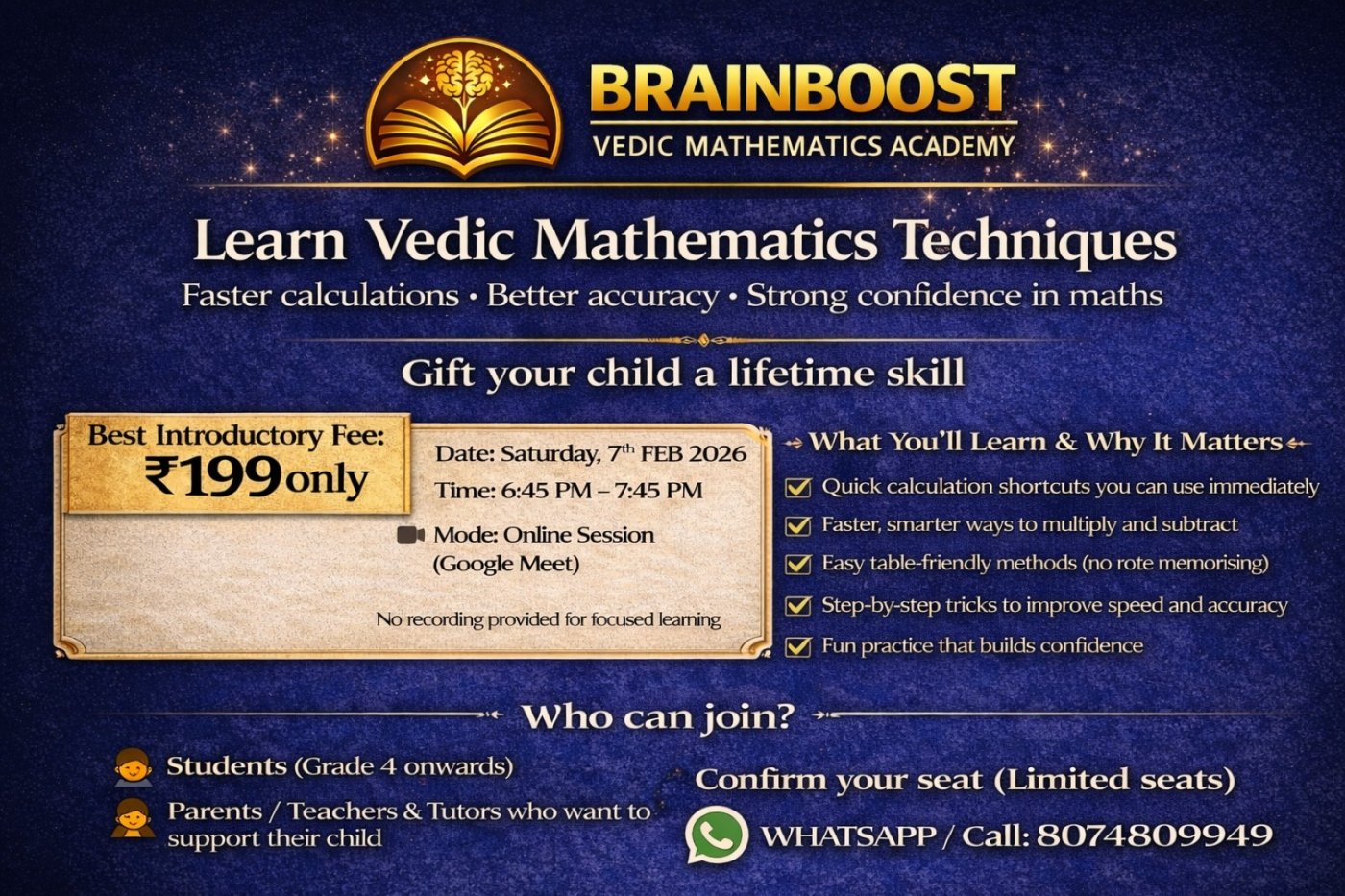 Join Learn Vedic Mathematics Techniques (Live) by BrainBoost Vedic Mathematics Academy.