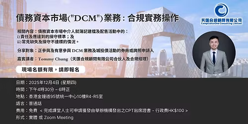 Follow ComplianceOne Consulting Limited天匯合規顧問有限公司(簡稱「天匯合規」)成立於 2017 年 4 月,是一間提供專業合規谘詢服務的顧問服務公司。自創立以來,團隊累積了許多成功經驗,包括為客戶申請證監會的第一類(證券交易)、第二類(期貨交易)、第四類(就證券提供意見)、第五類(就期貨合約提供意見)、第九類(提供資產管理)受規管活動牌照、香港聯交所交易權、香港期交所交易權、金錢服務經營者牌照,及成立開曼群島離岸基金等等的成功經驗。除了公司的團隊外,天匯合規亦會聯同金融行業的專業人士及律師,合作申請證監會的第三類受規管活動牌照(槓桿式外匯交易)、第六類受規管活動牌照(就機構融資提供意見)、放債人牌照,以至及保險經紀公司牌照,致力為客戶提供全方位的金融類牌照申請服務。我們的客戶來自世界各地,包括中國內地、台灣、韓國、柬埔寨、新加坡、英國、意大利等地區。客戶的背景由大型國有企業、期貨公司、國內註冊私募基金公司、家族辦公室、民管企業家、及加密貨幣服務商等等。
