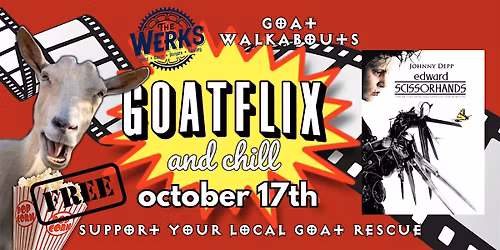 Follow Goatflix & ChillGoatflix and Chill is a unique movie night experience that combines the joy of cinema with the heartwarming presence of our friendly goats. This event supports both goat advocacy and human therapy, providing an engaging environment where guests of all ages can enjoy films alongside our playful, rescued goats.Our goats are more than just movie night companions; they are integral to our mission of promoting animal welfare and raising awareness for goat advocacy. All of our goats are rescues, each with their own story, and they serve as ambassadors for compassionate animal care.In addition to offering memorable entertainment, Goatflix and Chill has therapeutic benefits. Our goats bring calm and joy to the human heart, especially benefiting individuals in need of emotional support. They regularly participate in therapy sessions with Alzheimer’s patients, special needs communities, PTSD clients, and more. By attending this event, you not only enjoy a unique night out but also support our efforts in using animal-assisted therapy to make a positive impact on our community.