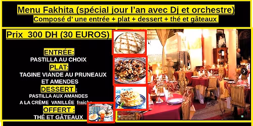 Jour de L’an du Pacha à prix doux : 180 DH ( 18 Euros) un menu dégustation et ambiance D.J. Un ch