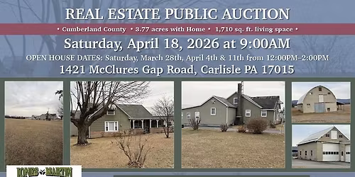 Real Estate Public Auction: 1421 McClures Gap Road, Carlisle PA 17015!