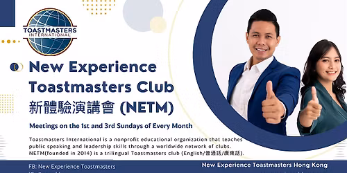 Follow New Experience Toastmasters ClubToastmasters International is a nonprofit educational organization that teaches public speaking and leadership skills through a worldwide network of clubs.NETM(founded in 2014) is a trilingual Toastmasters club (English/普通話/廣東話).[NETM MEETING DATE & TIME]1st Sunday (Mandarin/Cantonese) 2:30-4:30 (GMT+8) &3rd Sunday (English) 2:30-4:30 (GMT+8)*Welcome to arrive 15 minutes earlier to mingle with usTo know more about NETM, check out ourFB: https://cutt.ly/BmdLdxYIG: @netmhkWebsite https://newexperiencehktmc.com/