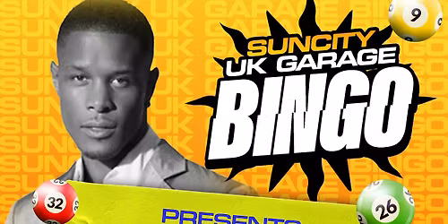 Follow SUN CITY UK GARAGE BINGOSUMMARYJoin us for an unforgettable evening of bingo and beats at our UK Garage Bingo Night! Immerse yourself in the infectious rhythms and soulful melodies of the UK garage scene while playing everyone's favourite game. From classic anthems to underground hits, our entertainment will transport you back to the heyday of UK garage music. Grab your bingo cards, gather your crew, and get ready to dab away to the sounds of UK Garage with a special guest. Don't miss out on this unique fusion of bingo and UK garage vibes – it's guaranteed to be a night filled with fun, laughter, and plenty of dancing! Entertainment /acts may be subject to change without prior notice.TIME TABLE9:00pm - Doors open with Sun City DJ & Host9:45pm - Sun City Bingo & DJ - Part 110:30pm - UK Garage Entertainment11:00pm - Sun City Bingo & DJ - Part 211:30pm - Sun City DJ & Host12:00am - CloseTICKET PRICESEntry = £13.50 Mecca MembersEntry = £16.00 Early BirdsEntry = £19.50 General AdmissionGROUP TICKETS4x Entry = £14.50 Each (Save £4.00)6x Entry = £13.00 Each (Save £5.50)10x Entry = £12.00 Each (Save £7.00)BINGO BOOKS ARE INCLUDEDNEW TO MECCA BINGO?Never been to a Mecca club before? Head down to your local club today- First 3 visits - £5 all your bingo- Free drink voucher- £5 Free Play Slots- £5 Free Play cashlinePlus, you will get discounts to all future events Mecca like to give new members a warm welcome, after all…