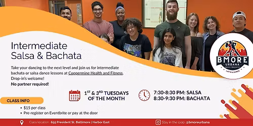 Follow Tiffany VlardExperience the rhythm of Latin dance every week with B-more Urbana! Join us for structured salsa and bachata classes every Monday and Tuesday at Maryland Athletic Club. Plus, don’t miss Latin Pulse Thursdays at Enigma Bar and Grill, featuring a free bachata class followed by an energetic dance social. Whether you’re a beginner or seasoned dancer, there’s something for everyone. Let’s move and groove together!