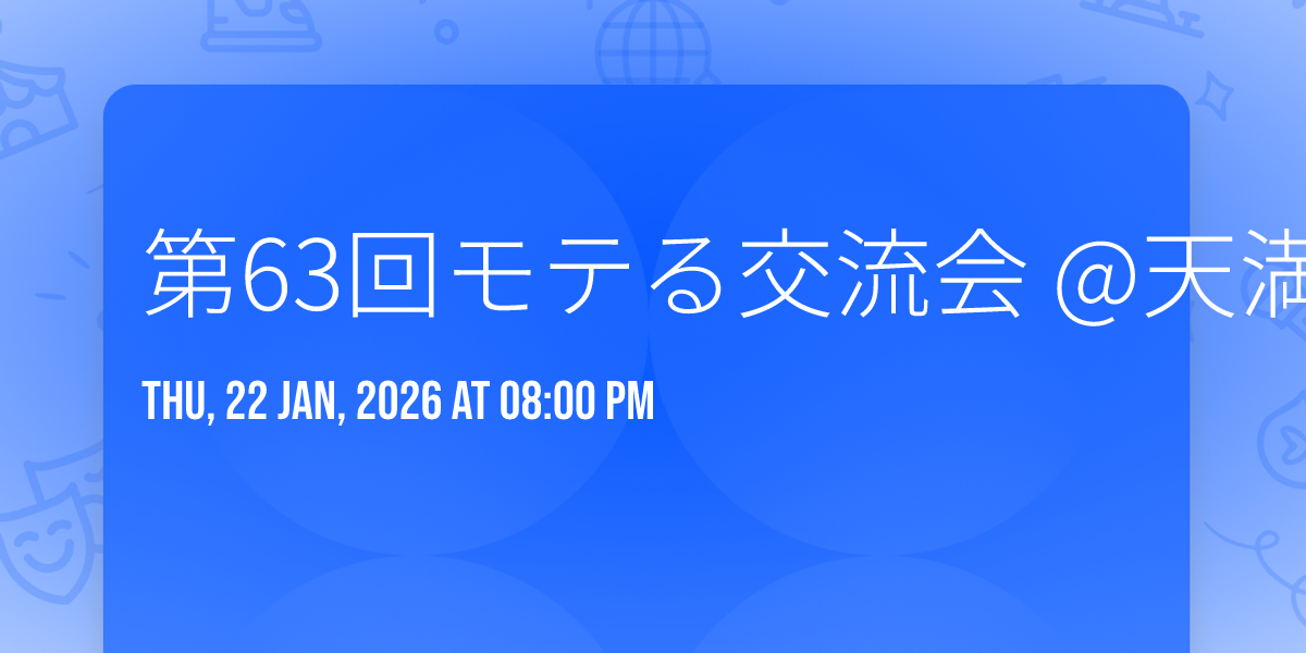 "image": "https://dyn-image.allevents.in/generate-image?v=4&title=%E7%AC%AC63%E5%9B%9E%E3%83%A2%E3%83%86%E3%82%8B%E4%BA%A4%E6%B5%81%E4%BC%9A+%40%E5%A4%A9%E6%BA%80%E6%A9%8B%EF%BC%88%E7%B4%8440%E5%90%8D%EF%BC%89&date=Thu%2C+22+Jan%2C+2026+at+08%3A00+pm&bg=4",