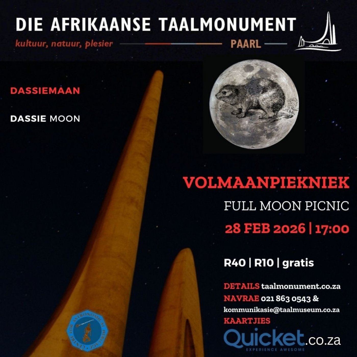 If you missed our popular picnics over the past summer, now is your chance to experience the last full moon picnic on SATURDAY, 28 FEBRUARY 2026 at the Afrikaans Language Museum and Monument (ATM). It once again promises to be a festive summer evening in a spectacular setting.