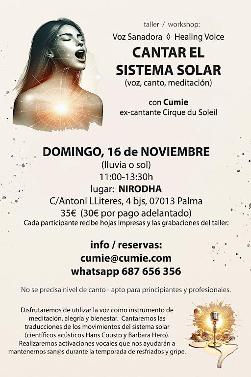 Disfrutaremos de utilizar la voz como instrumento de meditación alegría y bienestar. Cantaremos las traducciones al espectro audible de los movimientos del sistema solar. Además realizaremos activaciones vocales que te ayudarán a mantenerte sano/a durante la temporada de resfriados y gripe.