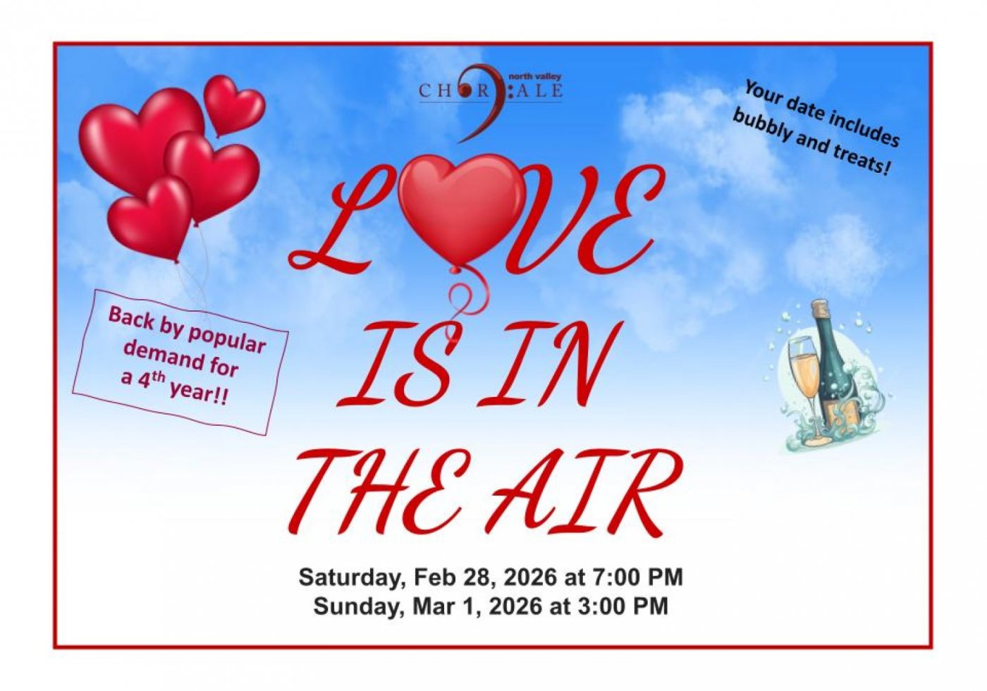 We’ve got the perfect Valentine’s Day gift for you: tickets to North Valley Chorale’s “Love Is in the Air.” Enjoy an intimate bistro setting as we present a cabaret-style show of popular songs that celebrate the love we share.
