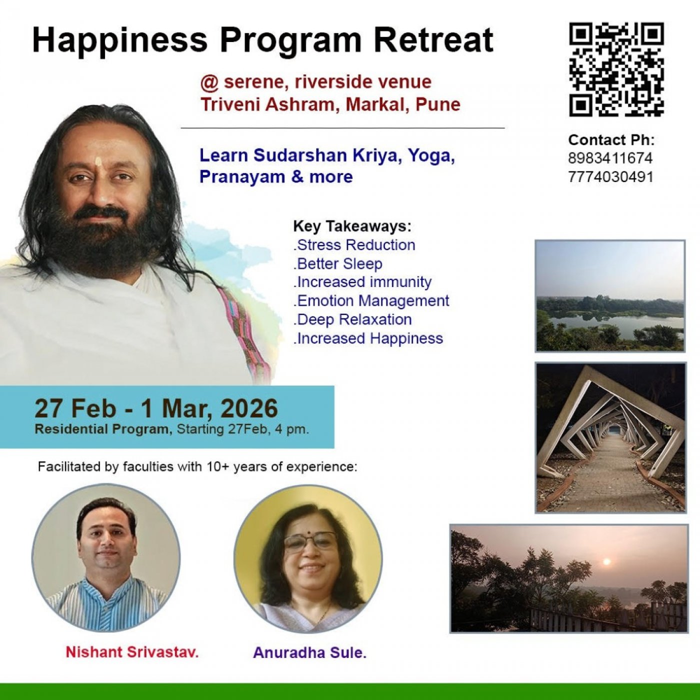 This retreat offers a rare opportunity to learn the globally recognized Sudarshan Kriya, a transformative breathing practice known to enhance clarity, vitality, and emotional balance.