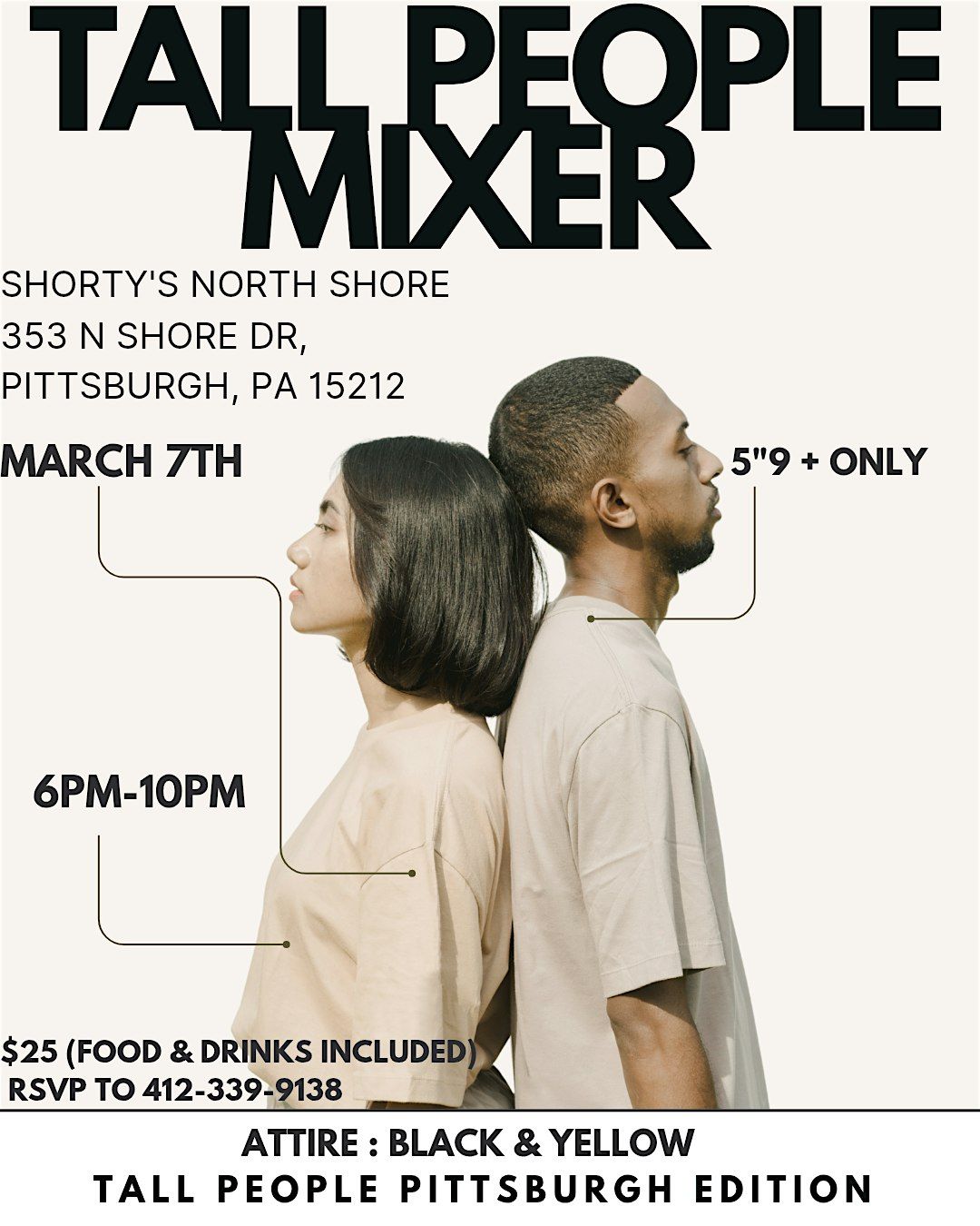 - **Event Description**: Meet tall folks, share laughs, and enjoy a chill hangout made just for the towering crowd!About this EventWelcome to the TALL PEOPLE MIXER!Hey there, tall folks! Join us for a super chill in-person hangout where you can meet other tall people, share laughs, and maybe even swap some fun stories about reaching the top shelves. It's all about good vibes, great company, and celebrating being tall together. Don’t miss out on this awesome chance to connect!Also Games to play ,food and drinksWHO WILL BR CROWNED TALL KING &amp; QUEEN OF DA BURGH?HEIGHT REQUIREMENTSMen 5"11+Women 5"9+ATTIRE : BLACK &amp; YELLOW