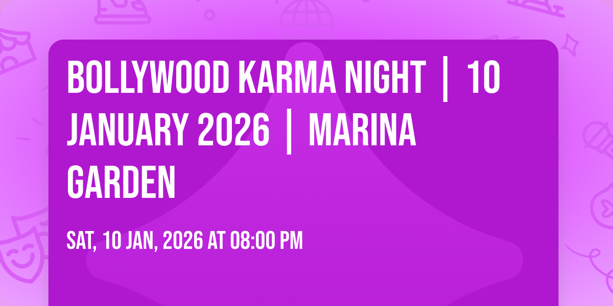 "image": "https://dyn-image.allevents.in/generate-image?v=4&title=%3F+BOLLYWOOD+KARMA+NIGHT+%3F+%7C+10+January+2026+%7C+Marina+Garden&date=Sat%2C+10+Jan%2C+2026+at+08%3A00+pm&bg=3",