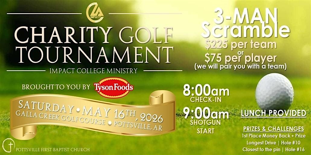 - **Event Description**: Join us for a day of golfing for a good cause at the 2nd Annual IMPACT Charity Golf Tournament!About this EventWelcome to the 2nd Annual IMPACT Charity Golf Tournament (3-Man Scramble)!Join us at the Galla Creek Golf Course &amp; Country Club for a day of fun on the greens for a great cause. Whether you're a seasoned pro or a beginner, this event is perfect for golfers of all skill levels. Get your friends together and let's scramble!CONTESTS &amp; PRIZES...PRIZES...AND MORE PRIZES...1st PLACE TEAM | Entry Fee Back + TBDLONGEST DRIVE (Hole #10) | TBD.CLOSEST TO THE PIN (Hole #16) | TBD**ROLLER BALL CONTEST** | TBDGet ready to tee off for charity and make an IMPACT throughout the world. The funds raised at this event will go toward our IMPACT Ministries, the college ministries of Pottsville First Baptist Church. IMPACT travels the globe spreading the Gospel of Jesus everywhere they go. In 2024 IMPACT went to the impoverished areas of Tijuana, Mexico and then in 2025 IMPACT was boots on the ground in the city of Antigua, Guatemala. This year they have the opportunity to serve in Central America. The funds raised during this tournament will go toward helping get the team on the ground in Central America.Don't miss out on this opportunity to support a good cause while enjoying a round of golf. Sign up today and let's make a difference together!For more information or opportunities to sponsor a hole, call Travis Garza at 479-970-7044**ROLLER BALL CONTEST Explained**In Roller Ball, every golfer playing in the tournament can pay $5 to have a ball with their name on it placed in a bucket. (Balls will be provided). At the end of the tournament, all of the balls will be rolled out onto the 9th green toward the pin. Whichever golfer's ball goes in the pin or is closest wins the prize. Golfers can pay to have as many balls placed in the bucket as they want. Of course the more balls they have in the bucket, the better the chances they have of winning.  https://cdn-az.allevents.in/events5/banners/2bd30ac0-013d-11f1-9f54-dfa1d1aacd36-rimg-w1200-h646-dc141419-gmir.jpg   https://cdn-az.allevents.in/events2/banners/2bfed5b0-013d-11f1-9f54-dfa1d1aacd36-rimg-w987-h740-dc161717-gmir.jpg   https://cdn-az.allevents.in/events6/banners/2c2ee660-013d-11f1-83dc-8dac76d29c25-rimg-w1200-h563-dc15121a-gmir.jpg   https://cdn-az.allevents.in/events4/banners/2c55a840-013d-11f1-83dc-8dac76d29c25-rimg-w987-h740-dc171819-gmir.jpg