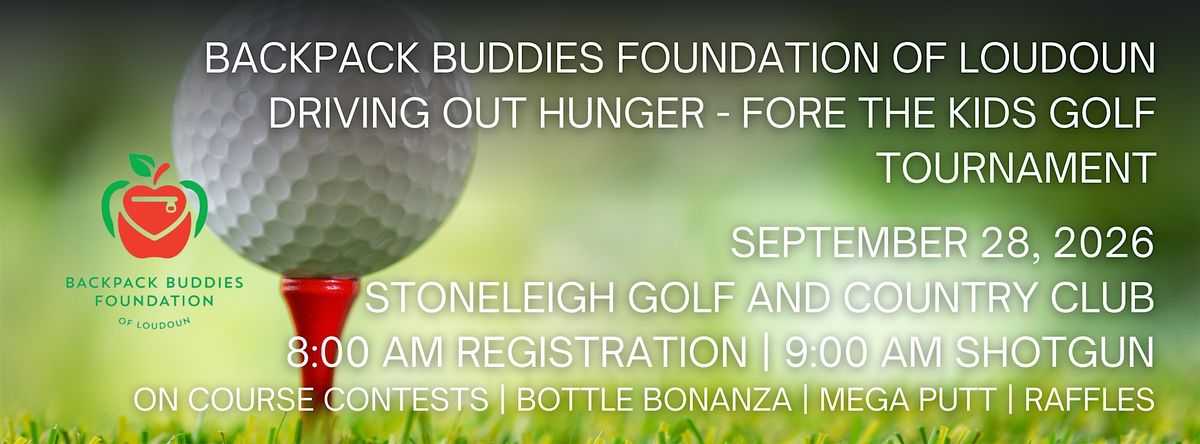 - **Event Description**: Join us for a day of golfing fun while helping drive out hunger in our community!About this EventBe part of something meaningful and memorable. The Backpack Buddies Foundation of Loudoun is proud to launch our Second Annual Driving Out Hunger Golf Tournament, and we invite you to join us as a sponsor in the fight against childhood hunger right here in our community.This high-visibility event at the beautiful Stoneleigh Golf and Country Club will bring together local business leaders, community champions, and generous donors for a day of golf, networking, and impact. As a sponsor, your brand will be prominently showcased to a committed audience, with opportunities for on-site engagement, recognition across marketing channels, and direct connection to our mission of feeding hungry children in Loudoun County.With a 9:00 AM shotgun start, on-course contests, bottle bonanza, mega-putt, raffles, and more, this is your chance to align your company with a great cause—while enjoying a great day on the green. Multiple sponsorship levels are available to fit your goals and budget.Help us Drive Out Hunger—one swing at a time.Secure your sponsorship or foursome today and make a difference that lasts well beyond the 18th hole.