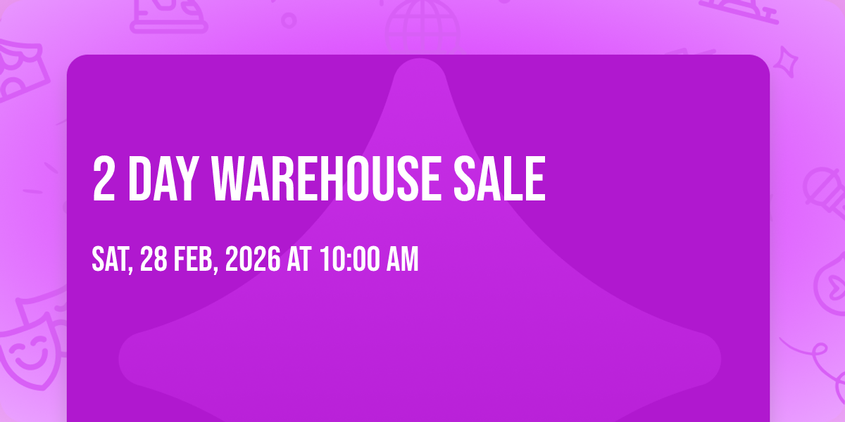 "image": "https://dyn-image.allevents.in/generate-image?v=4&title=2+Day+Warehouse+Sale&date=Sat%2C+28+Feb%2C+2026+at+10%3A00+am&bg=3",