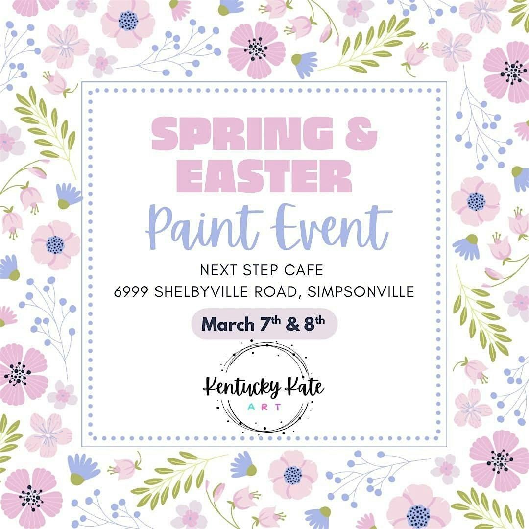 - **Event Description**: Unwind, create, and connect at our paint event! No artistic skills required. Bring your friends and your enthusiasm!About this EventJoin KY Kate Art for a St. Patrick’s Day, Easter &amp; Spring Paint Event! Ten sign choices including a 16" Shamrock Round, Rainbow-Pot of Gold and Shamrock, Snoopy Easter Egg, Bunny Easter Egg, Tulip Cross, 16" Umbrella with Flowers Round, 16" Happy Easter Round, Silly Goode, Lady Bug &amp; Flower and Charlie Brown with Kite.Bring a friend or come alone… you will have a good time painting a piece you’ll be proud of and destress with creativity.This paint event is hosted by KY Kate Art and held at Next Step Cafe (formerly Brick+Mortar) in Simpsonville, KY. Next Step is conveniently located just off the Outlet Shoppes of the Bluegrass exit.Attendees receive all materials including pre-lined wood sign, wire and optional bow to attach. Once sealed the sign can be used indoors or out for years to come! (Sealant is not applied at events due to the odor.) *Pictures are for inspirational purposes only, colors/ ribbons may vary due to availability.Reserve your spot now…tickets go quick! $35 (+Ticket fee).PAINT EVENT POLICY INFO:-CONTACT INFO: Please enter correct email address for yourself and any (adult) attendee(s) you purchase seats for. This is the only method of communication utilized aside from social media.-SIGN SELECTION: Please enter your sign selection for “YOU PICK” events upon checkout. If sign selection is not entered into EventBrite, KKA will select &amp; prepare an option for you.-AGE POLICY: Must be age 12+ to attend.-FOOD/DRINKS: Please note food &amp; drink are not included in your ticket.*The Cafe has many cold &amp; hot beverages along with various treats &amp; sandwiches for sale during Saturday events.*The Cafe is not open on Sundays. You may bring in a beverage of choice! Please no large items (like cake/pies, pizza, trays of food) as space is limited and needed for creating!Alcohol is not permitted at KKA events.-SEATING: If meeting a friend(s) please email me the NAME(S) so I can do my best to seat you together. Space is limited. Please do not carry in large items that infringe upon the space of fellow attendees.-ATTENDANCE: No unregistered guests, pets, children under 12, strollers or infants.-NO REFUNDS: Transfers or event credit eligible within 72 hours before the scheduled event. Only events cancelled by KKA will be refunded.-EVENT TIME: We start painting at the scheduled start time. Please arrive 15 minutes prior so you have the full 2 1/2 hours to paint your masterpiece. Katie will provide an introduction along with basic instructions at the beginning of the event.-CONTACT: Please direct message KKA on Facebook Messenger or send an email to KYkateArt@outlook.com. Please do not contact the venue regarding KKA paint events.I look forward to painting with you soon!