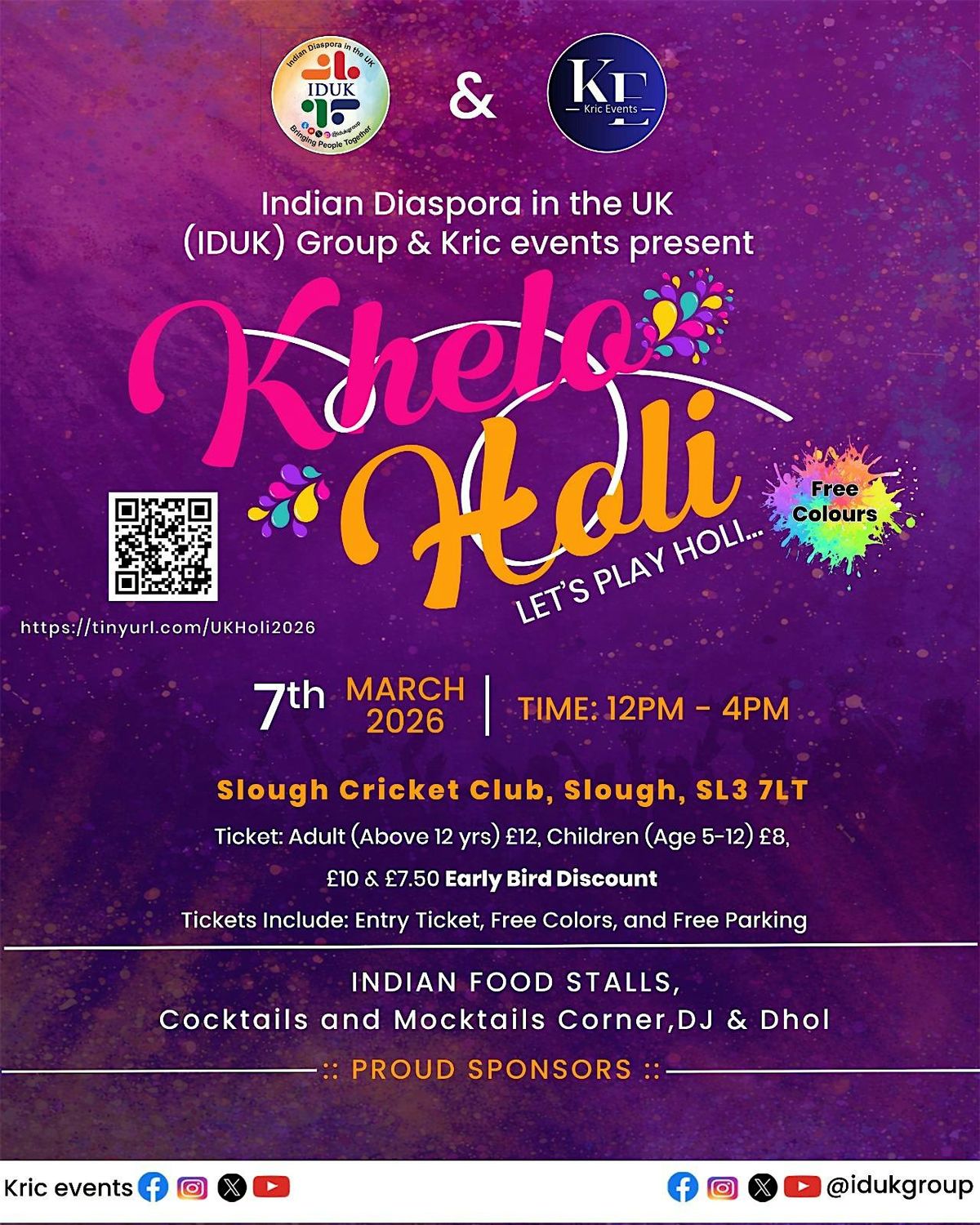 - **Event Description**: Join the vibrant Holi bash at Slough Cricket Club with IDUK Group &amp; Kric Events for fun, colors, and cricket vibes!About this Event? Khelo Holi Event?✨ Indian Diaspora in the UK (IDUK) Group &amp; Kric Events proudly presents ✨Join us for an unforgettable one of the biggest Holi events in the United Kingdom with Music, Flash Mob, Dance, Food, Drinks, Photo Booth, Unlimited Colors, and Full of Entertainment on Saturday, 7 March, from 12 PM to 4 PM at the vibrant Slough Cricket Club - SL3 7LT.? Known as the best Holi event in town, this lively celebration promises a day of joy for everyone.?‍?‍?‍? What’s in store?? Electrifying DJ beats and dance? Free Colors? Delicious food stalls &amp; refreshing Cocktails, Mocktail stalls to indulge in? Fun-filled Photo Booth to capture lasting memories???Flash Mob, Bhangra, Dance PerformancesFree Car Parking is available (subject to availability), so you don’t have to worry about anything but having a fantastic time!? Grab your tickets today and be a part of this vibrant festive celebration—let’s make it a day of joy, colors, music, and memories to cherish forever! ??Please note - This is a non-refundable ticket that covers entry only and does not include food or beverages.*EVENT PHOTOGRAPHY DISCLAIMER!!By attending Khelo Holi 2026 event, you agree to be photographed and filmed for promotional use on social media, websites, etc. If you prefer not to be captured, please avoid camera areas.  https://cdn-az.allevents.in/events8/banners/a9428fa0-0127-11f1-83dc-8dac76d29c25-rimg-w592-h740-dc73187a-gmir.jpg