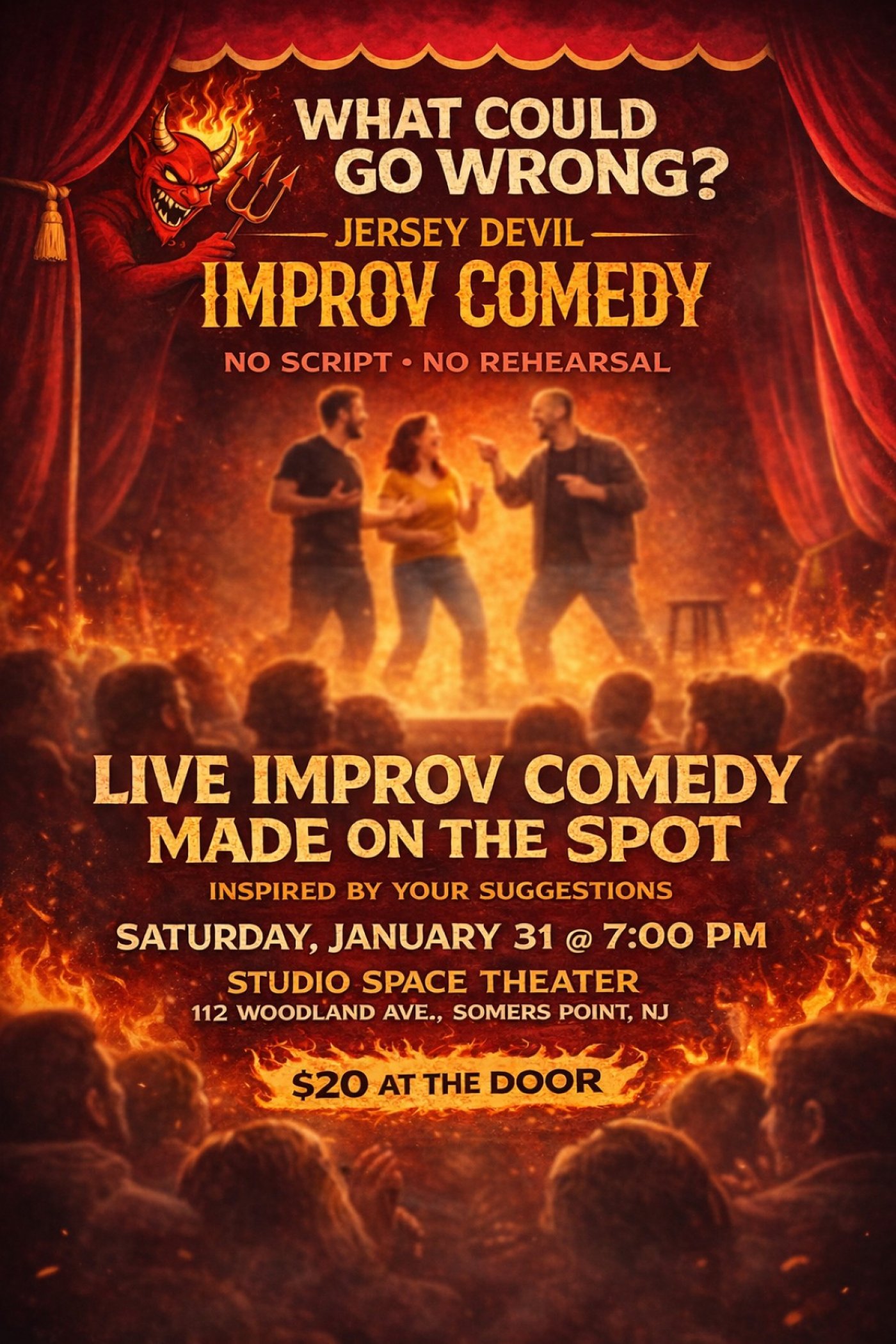Jersey Devil Comedy presents a live improv show where scenes, characters, and moments are created entirely on the spot — fueled by audience suggestions and the performers’ ability to embrace chaos. Every show is different, fast-moving, and unrepeatable.