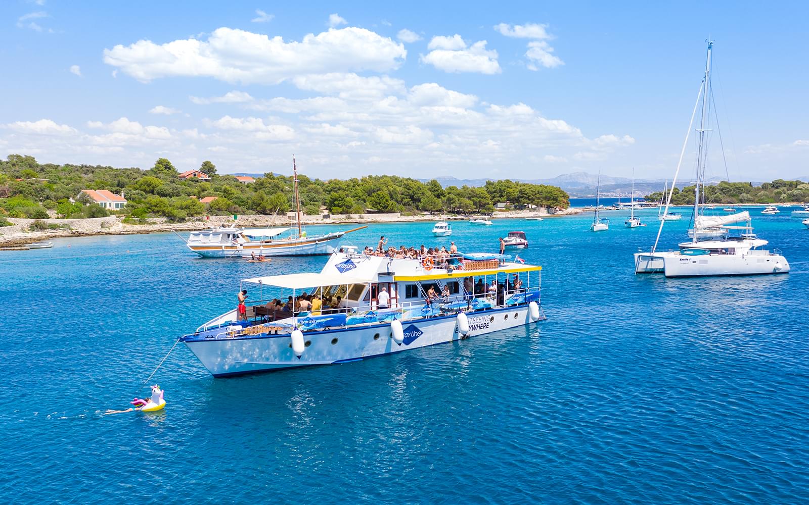 Arrive at the Gray Line Croatia meeting point in Split and present your voucher for check-in. After a short welcome briefing from the captain and crew, choose your lunch option (beef, tuna, or vegetarian burger). Once aboard, settle in as the boat departs along the Dalmatian coast toward the first swim stop.