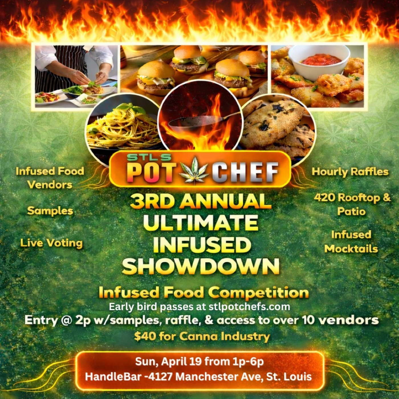 St. Louis’ largest and most anticipated 420 cannabis culinary event returns for Year 3, and this time, we’re turning up the heat! With double the space, an indoor-outdoor setup, a 420 rooftop, and a heated 420 patio, this year’s competition is set to be an unforgettable experience for both chefs and food lovers alike!