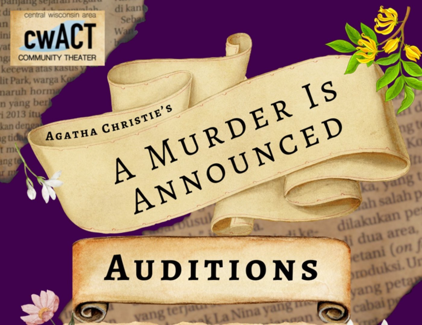 Auditions for Agatha Christie's "A Murder Is Announced" will be at cwACT March 9-10 at 6:30 pm.