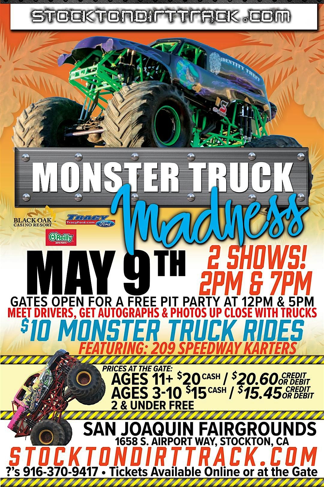 - **Event Description**: Get ready to experience the ultimate adrenaline rush with roaring engines, flying dirt, and jaw-dropping stunts at the Monster Truck MadnessAbout this EventMONSTER TRUCK MADNESS featuring Rock Star, California Kid, Identity Theft, Spitfire, Reverse Racer, Titan Monster Trucks, Monster Truck Rides and 209 Speedway Karters!Do you have what it takes to survive the Madness? Monster Truck Madness is roaring into Stockton, at the San Joaquin Fairgrounds on SATURDAY - May 9th with 2 Back to Back Shows!San Joaquin County Fairgrounds 1658 S. Airport Way, Stockton, CA 95206.Gates open for a free* Pit Party at Noon &amp; 5pm (See the trucks up close, meet the drivers, get photos and autographs) *Included with paid admissionShows start at 2pm and 7pm$10 Monster Truck Rides during Pit Party, Intermission and at end of each show.ADMISSION PRICES at the GATE cash (credit/debit)$20 ($20.60) Ages 11+ Admission$15 ($15.45) Kids (3-10) AdmissionKids 2 &amp; Under FREE (Ticket not required)Admission will also be available for purchase the day of event at the ticket window starting at Noon for the 2pm show and 5pm for the 7pm show. We will not sell out as there is lots of seating in the grandstands with no obstructions, all seats are good seats. First come, first serve seating.No outside food or beverage, one unopened bottle of water per person$10 Parking (Cash Only)StocktonDirtTrack.comPresented by the Noceti Group, Inc.916-370-9417 cellNO REFUNDS  https://cdn-az.allevents.in/events2/banners/caea5560-f502-11f0-a0d9-23f031643b6b-rimg-w493-h740-dc908f90-gmir.jpg   https://cdn-az.allevents.in/events8/banners/cb07ef80-f502-11f0-a0d9-23f031643b6b-rimg-w1200-h576-dcffffff-gmir.jpg