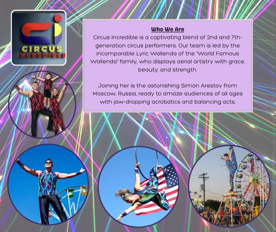 The 67th annual fair features thrilling midway rides for the whole family including a 110-foot-tall Ferris wheel, concerts (country artist Will Jones, Stella Beat, 4nrs Journey and more), Circus Incredible starring aerialist Lyric Wallenda, Pharoah's Wildlife Kingdom reptile show, Magic Man TJ Hill, Benjamin Jackson Comedy Hypnotist Show, livestock shows, Home Arts exhibits, vendors and favorite fair food.