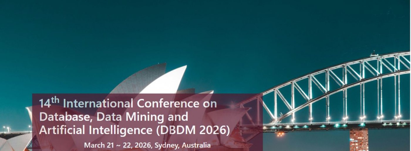 14th International Conference on Database, Data Mining and Artificial Intelligence (DBDM 2026) provides a premier forum for researchers, practitioners, and industry experts to present and discuss the latest innovations, trends, results, and challenges across databases, data mining, and AI driven intelligent systems. The conference aims to foster collaboration and knowledge exchange through high quality, peer reviewed research contributions.