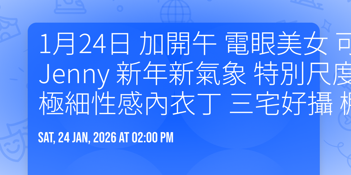 "image": "https://dyn-image.allevents.in/generate-image?v=4&title=1%E6%9C%8824%E6%97%A5+%E5%8A%A0%E9%96%8B%E5%8D%88+%E9%9B%BB%E7%9C%BC%E7%BE%8E%E5%A5%B3+%E5%8F%AF%E6%85%BE%E5%8F%AF%E7%94%9C++32GG+%E7%B4%AB%E7%8E%B2+%E6%9E%97%E7%BF%8E++%E4%B8%89%E5%AE%85%E5%A5%BD%E6%94%9D++%E6%A3%9A%E6%8B%8D++%E6%B4%BB%E5%8B%95%E6%9C%8D%E8%A3%9D+%E5%85%A7%E5%AE%B9%E5%9C%A8%E5%85%A7%E6%96%87++%E7%BC%BA2%E6%BB%BF&date=Sat%2C+24+Jan%2C+2026+at+02%3A00+pm&bg=4",
