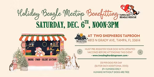 Bring your friends and beagles to Two Shepherds Taproom on Saturday, December 6th, Noon-3pm for a beagle meetup and fundraiser for Tampa Bay Beagle Rescue. We will have a silent auction item for you to bid on that would make great holiday gifts. 100% of... Read More