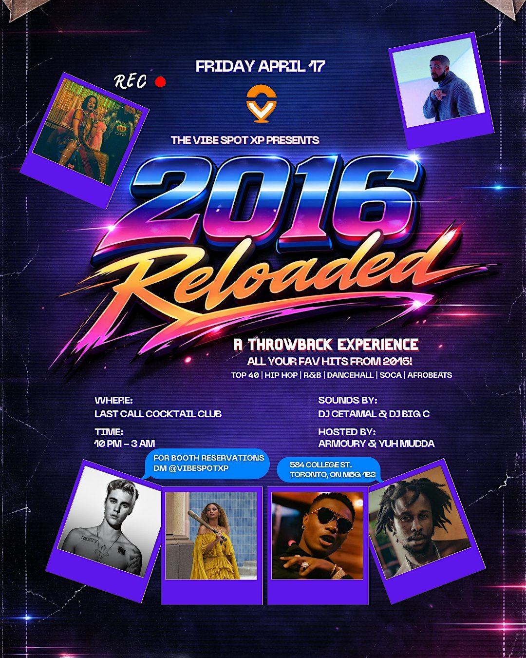 - **Event Description**: 2016 Reloaded! The ultimate throwback vibe! Back to back hits, nonstop energy, waist moving riddims &amp; sing along anthems.About this EventWelcome to 2016 RELOADED (A Throwback Experience) happening at Last Call Cocktail Club on April 17, 2026 at 10:00 PM. Get ready to travel back in time and relive the energy, music, and unforgettable vibes of 2016. 🎉 This is your chance to dust off those iconic fits, call your crew, and experience a night packed with nostalgia, dancing, and pure throwback magic.We’re bringing back the hits that defined an era — the songs you forgot you loved and the ones you never stopped playing. From club anthems to R&amp;B, hip hop, dancehall, and more, the vibe will be non-stop all night.We’re also celebrating ALL ARIES! ♈️If it’s your birthday season, this is your moment — birthdays, bottles, and main character energy all night long. Whether you’re celebrating a special occasion or just coming out to dance, this is the party you don’t want to miss.Booth packages are available — DM @vibespotxp on Instagram for details and reservations.Please note: All ticket sales are final. No refunds.Get ready for an unforgettable night… see you on the dance floor. 🕺🎶