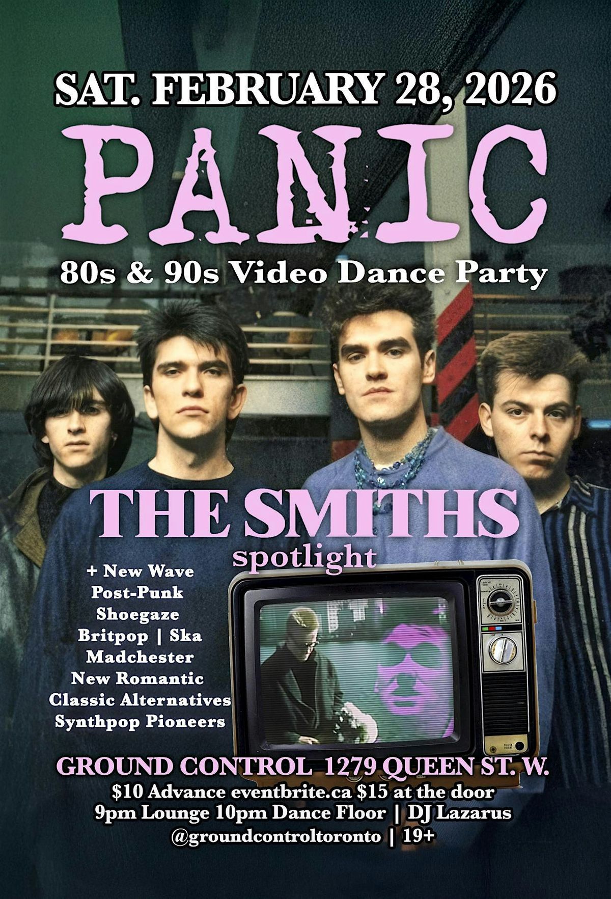 - **Event Description**: PANIC brings you the coolest music from the 80s and 90s plus a packed dance floor every month. February with have THE SMITHS Spotlight.About this EventLiving On Video + DJ Lazarus presentsSat Feb 28 - PANIC: 80s/90s Video Dance Party w/ THE SMITHS SpotlightADVANCED TIX $10: https://PANICsmithsspotlight.eventbrite.caPANIC is a brilliant evening of new wave, post-punk, classic alternatives, synth pioneers, britpop, shoegaze, madchester, new romantic, classic industrial, ska, and more.Join hundreds of your friends dancing to the coolest retro tunes at PANIC.Saturday February 28, 2026PANIC: 80s/90s Video Dance Party w/ THE SMITHS SpotlightGround Control - 1279 Queen St West - Toronto@groundcontroltorontoLounge 9pm - Mainroom 10pm 19+ eventAdv. Tix ONLY $10: https://PANICsmithsspotlight.eventbrite.ca$15 at the doorINVITE: www.facebook.com/events/906531455595436/(please INVITE your friends)----------SOCIAL:www.instagram.com/groundcontroltorontowww.facebook.com/livingonvideoclubwww.facebook.com/djlazarusrockswww.twitch.tv/livingonvideoclubwww.mixcloud.com/livingonvideowww.instagram.com/djlazarusrockswww.twitter.com/djlazarusrocks