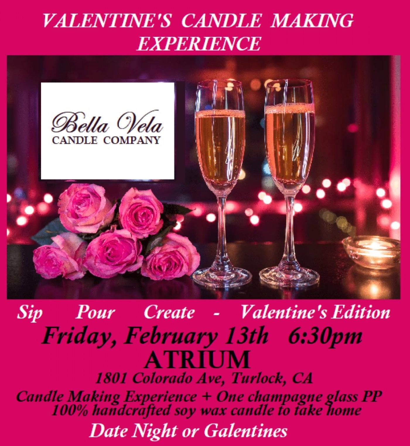Celebrate Valentine’s Day with a cozy, hands-on experience. Create your own handcrafted soy candle using romantic, Valentine-inspired fragrances in a warm, intimate setting.