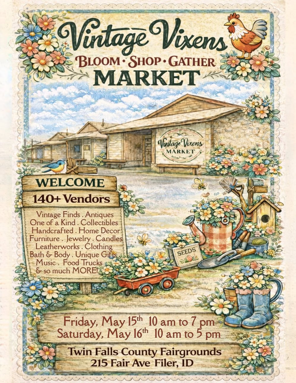 The Vintage Vixens Market is BLOOMING early this year. Mark your calendars for May 15th and 16th! You don’t want to miss this event.