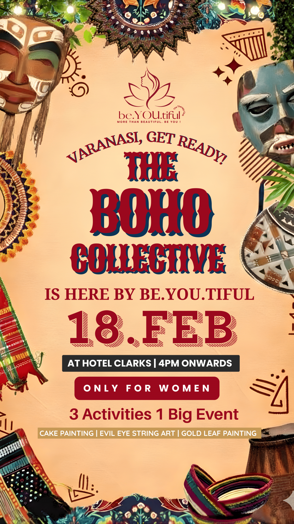 Step into a world of creativity, music, and mindful celebration at **THE BOHO COLLECTIVE **, an exclusive women-only experiential evening curated by *Team Be.You.Tiful*. This event is thoughtfully designed for women who want a refreshing recreational break from routine life β whether you are a working professional, entrepreneur, homemaker, or student.