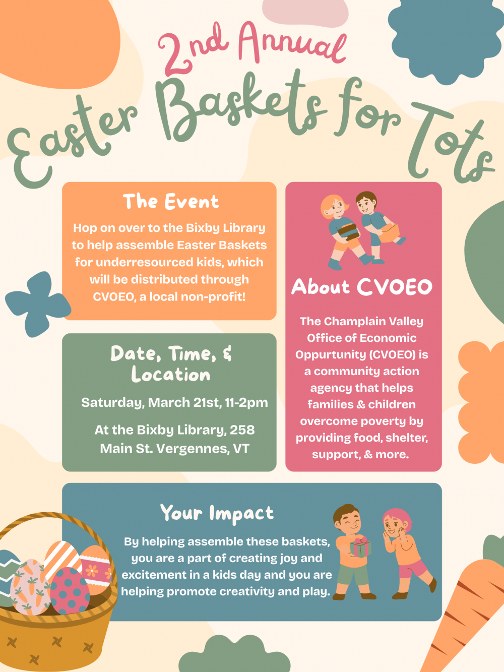 The Easter baskets will be distributed through the Champlain Valley Office of Economic Oppurtunity (CVOEO), a local nom-profit.