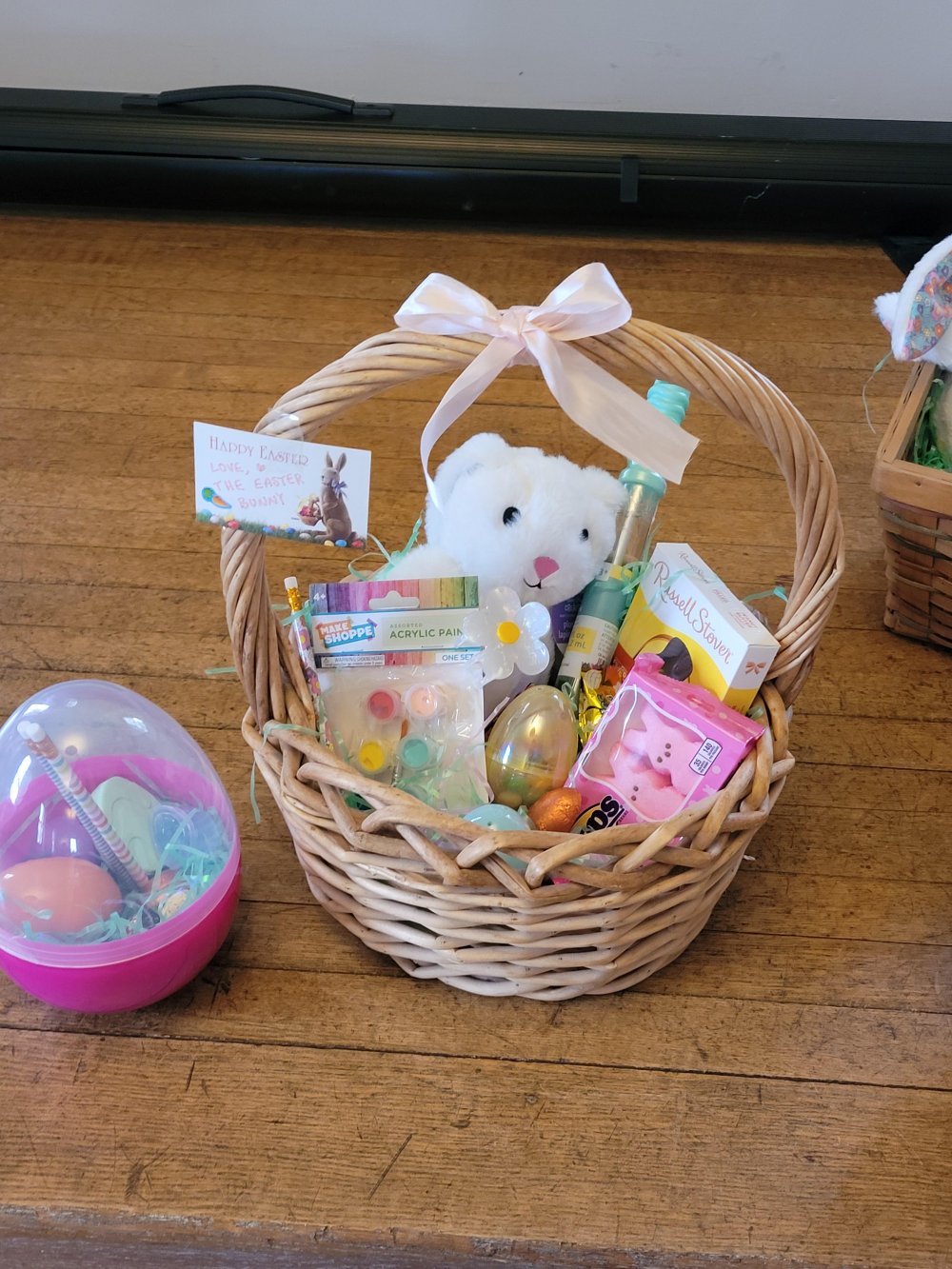 First, choose your basket and paper grass. Then, fill it with your choice of chalk, bubbles, toys, candy & treats, stuffed animals and more! 🍬🧸🎨