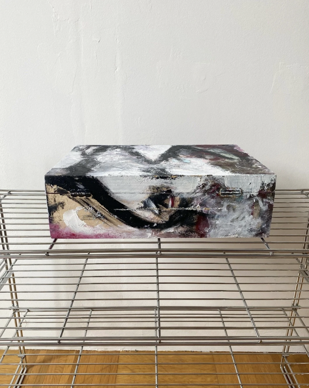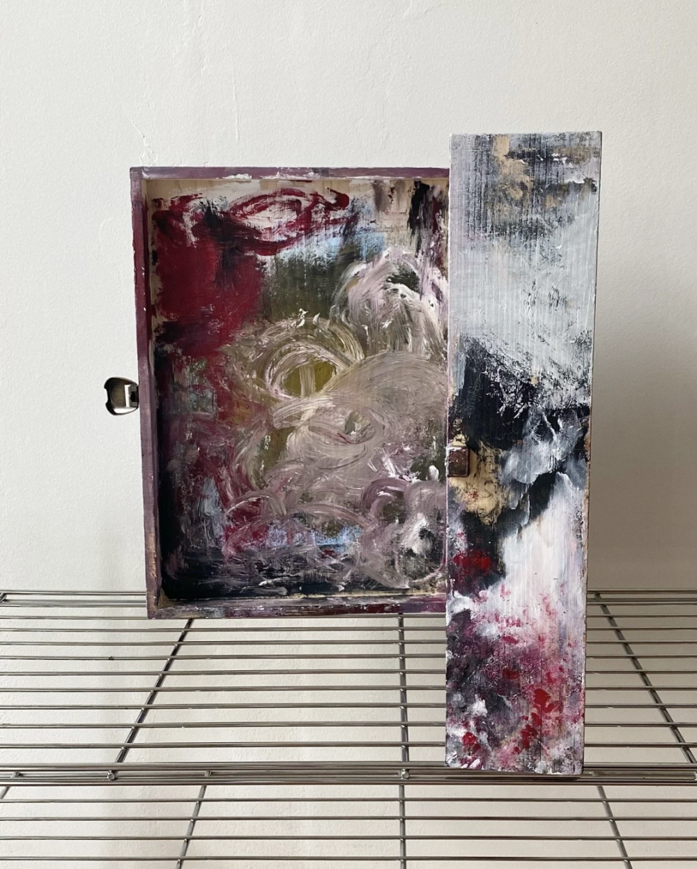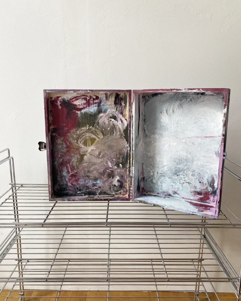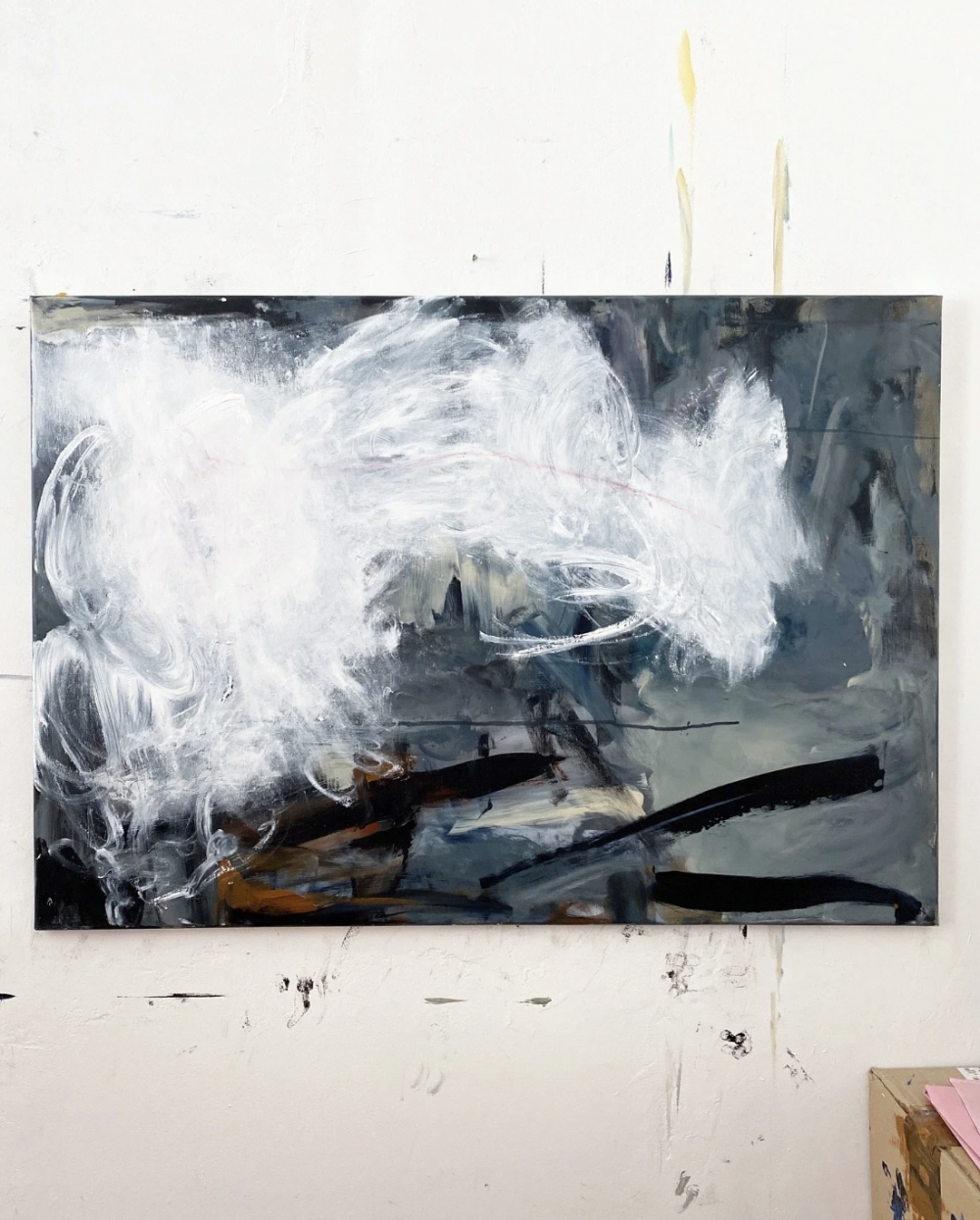 The exhibition and artworks explore grief, as an emotion that usually in a sudden and overwhelming movement takes over a person. White paint resembles it, similar to fog or clouds. The main painting moves to the background, still visible, changing. The red lines in each artwork mark the connection and ending of the process, the realization and documentation of the rising of something new.