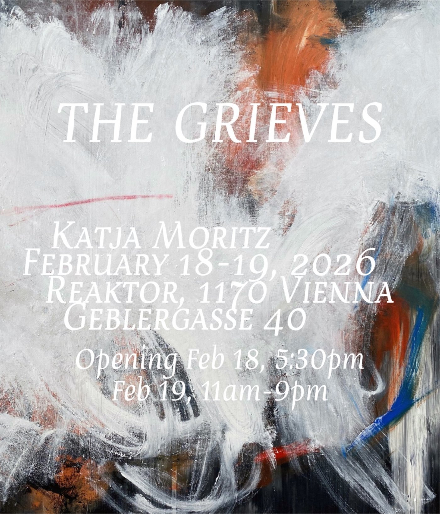 Die Ausstellung THE GRIEVES präsentiert eine Reihe von Kunstwerken von Katja Moritz mit dem Titel GHOST SERIES (Grief 1-10). Sie thematisiert die Auswirkungen von Trauer und anderen starken Emotionen auf einen Menschen. Weißer Nebel überzieht zunächst das „Hauptbild“, die Geister, bis sich diese miteinander verbinden und ein neues Bild, eine neue Person, entsteht.